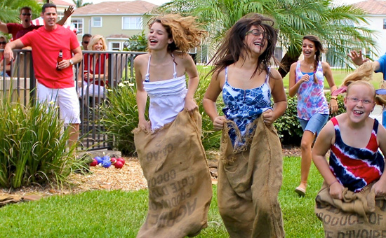 Because kids never want to stop playing to drink anything, it's hard to keep them hydrated in the summer heat. But give them a frozen pop, and they will sit and eat it. I layer red, white and blue sports drinks in plastic cups and freeze them with Popsicle sticks. It works great, and kids love them. This way, we know they won’t be overheated when we start the old-fashioned sack race.