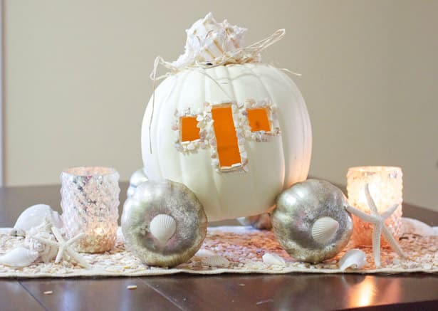 My niece loved the idea of creating a fairy tale carriage using seashells. Using a linen runner I sprinkled broken seashells to create the road. Create a centerpiece for a princess themed tea party for the girls or add a little magic to their bedroom.