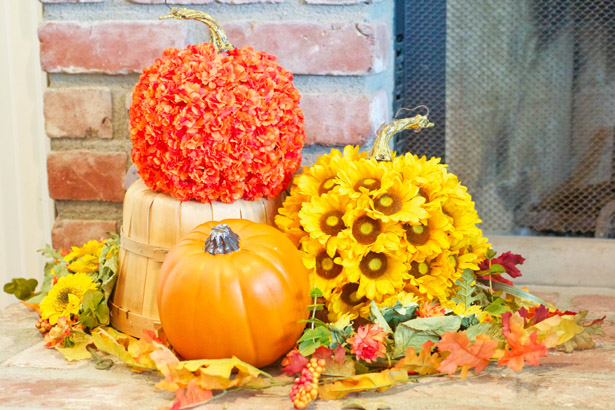 Daisy Pumpkin: Pick pumpkins with the largest stem so that it will still show after you glue on the flowers. Buy bunches of fake daisies to equal 30 daisies of similar size and remove the stem. Trim to ensure flowers are flat on the backside. Adhere to the pumpkin using a hot glue gun.