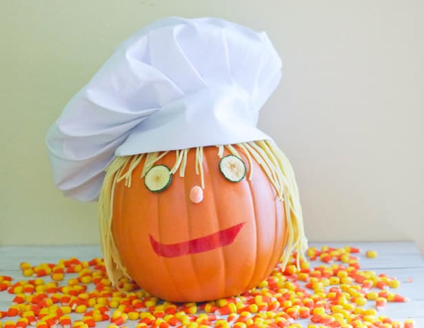 Kids will love using spaghetti noodles and vegetables to create this Food Chef Pumpkin. Cut a mouth out of a fruit roll ups before adding zucchini eyes and a carrot nose. Use scissors to style the hair.