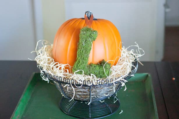 Customize a simple pumpkin with a moss-covered initial. Use a basket or container filled with straw to set the pumpkin in. I spray painted a basket black.