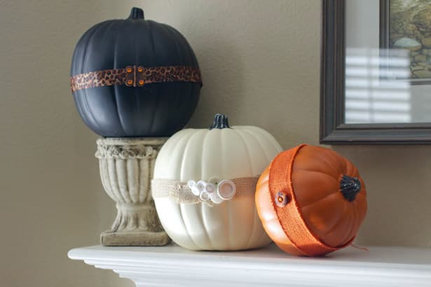 This is the easiest way to dress up your pumpkins. Place masquerade masks on various size pumpkins. It doesn’t get easier than this. You can get fancy using masks that are animal print or feathered.
