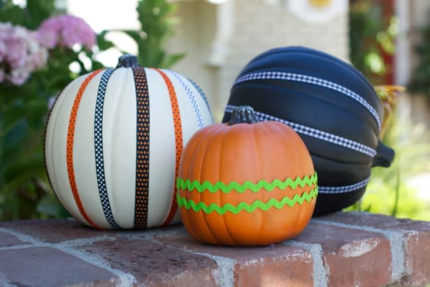 Ribbon-covered pumpkins added a splash of color to the outside entryway. Look for mini rolls of ribbon at your local craft store.