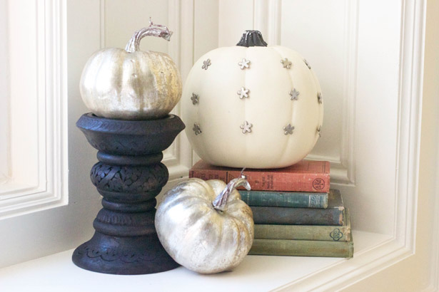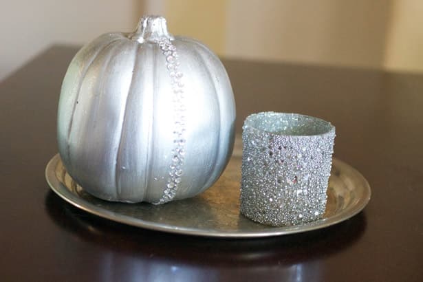 Paint pumpkin with two coats of silver metallic paint. Let dry. Attach strip of rhinestones down one groove of the pumpkin from stem to underneath.