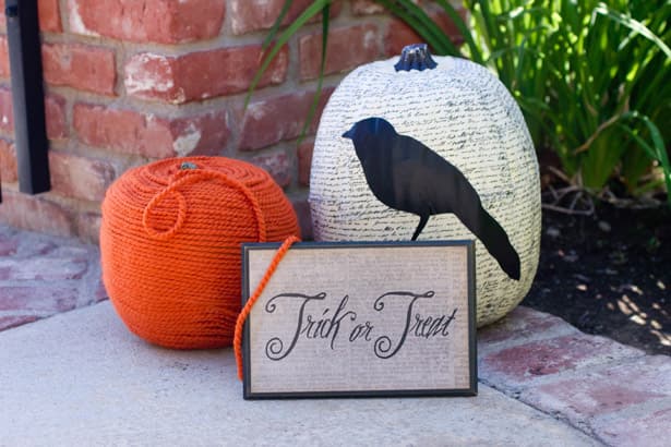 Spray half the pumpkin with adhesive and start wrapping the yarn around from bottom to top. Leave about a foot extra yarn and wrap around to create a little design. I did a little circle and then draped around a little “Trick or Treat” sign.