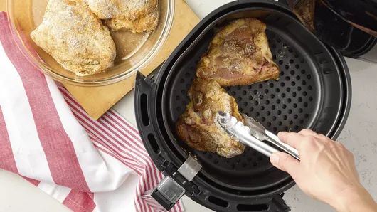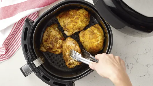 var configuration = {"title":"Air Fryer Chicken Thighs","servingSize":"1 Chicken Thigh","image":{"small":{"media":"(min-width: 0px)","src":"https://mojo.generalmills.com/api/public/content/scz_B76bT0Wn6Xfj8iiNDA_webp_base.webp?v=ce38ef05\u0026t=e724eca7b3c24a8aaa6e089ed9e611fd"},"medium":{"media":"(min-width: 500px)","src":"https://mojo.generalmills.com/api/public/content/scz_B76bT0Wn6Xfj8iiNDA_webp_base.webp?v=ce38ef05\u0026t=191ddcab8d1c415fa10fa00a14351227"},"large":{"media":"(min-width: 767px)","src":"https://mojo.generalmills.com/api/public/content/scz_B76bT0Wn6Xfj8iiNDA_webp_base.webp?v=ce38ef05\u0026t=191ddcab8d1c415fa10fa00a14351227"},"alt":"Air Fryer Chicken Thighs"},"contributor":{"label":"By","name":"Betty Crocker Kitchens","profileUrl":"/about-us","displayDate":{"label":"Updated","date":"Jan 31, 2024"}},"ingredientGroups":[{"ingredients":[{"quantity":"4","description":"bone-in skin-on chicken thighs (6- to 8-oz each)"},{"quantity":"1","description":"tablespoon olive oil"},{"quantity":"2","description":"tablespoons Gold Medal™ All-Purpose Flour"},{"quantity":"1 1/2","description":"teaspoons Italian seasoning"},{"quantity":"1","description":"teaspoon salt"},{"quantity":"1","description":"teaspoon garlic powder"},{"quantity":"1","description":"teaspoon onion powder"},{"quantity":"1/2","description":"teaspoon paprika"},{"quantity":"1/2","description":"teaspoon ground black pepper"}]}],"steps":[{"description":"Coat chicken thighs on both sides with oil. In large bowl, mix remaining ingredients. Add chicken and turn to coat, pressing to adhere.","stepShotImageUrl":"//mojo.generalmills.com/api/public/content/7ykQ00EwSzuKkVYegdxoTw_webp_base.webp?v=2c43d810\u0026t=51a43a57af4046789e5a7f20567b1195"},{"description":"Spray air fryer basket with cooking spray. Place chicken in air fryer basket, skin sides down. Set to 400°F; cook 9 minutes.","stepShotImageUrl":"//mojo.generalmills.com/api/public/content/E4RZBy1TSAy4NUbM5y7G6w_webp_base.webp?v=0baec51f\u0026t=51a43a57af4046789e5a7f20567b1195"},{"description":"Turn chicken skin sides up; cook 10 to 16 minutes longer or until juice of chicken is clear when center of thickest part is cut to bone (at least 165°F).","stepShotImageUrl":"//mojo.generalmills.com/api/public/content/-FtWjRtpTFCdZuVBY5Zadw_webp_base.webp?v=b4e62a8e\u0026t=51a43a57af4046789e5a7f20567b1195"}],"tips":[{"title":"","description":"Air fryer temperature control settings vary according to brand and model. If your air fryer does not have the exact temperature setting called for in the recipe, consult your manual for suggested temperature settings.","category":"Method Note","tipShots":[]},{"title":"","description":"Our recipes do not call for preheating your air fryer. Just set the temperature, and start.","category":"Method Note","tipShots":[]},{"title":"","description":"We tested this recipe in a 3.7-quart air fryer. If using a larger air fryer, such as 6-quart size, cooking time may be reduced.","category":"Method Note","tipShots":[]},{"title":"","description":"For a pop of fresh green color and flavor, top with chopped fresh flat-leaf Italian parsley leaves just before serving.","category":"Presentation/Garnish","tipShots":[]},{"title":"","description":"Kitchen Tested: 1/2024","category":"Kitchen Tested","tipShots":[]}],"kitchenTips":[{"title":"","description":"Air fryer temperature control settings vary according to brand and model. If your air fryer does not have the exact temperature setting called for in the recipe, consult your manual for suggested temperature settings.","category":"Method Note","tipShots":[]},{"title":"","description":"Our recipes do not call for preheating your air fryer. Just set the temperature, and start.","category":"Method Note","tipShots":[]},{"title":"","description":"We tested this recipe in a 3.7-quart air fryer. If using a larger air fryer, such as 6-quart size, cooking time may be reduced.","category":"Method Note","tipShots":[]},{"title":"","description":"For a pop of fresh green color and flavor, top with chopped fresh flat-leaf Italian parsley leaves just before serving.","category":"Presentation/Garnish","tipShots":[]}],"additionalContent":[],"faq":[],"tipCategories":[{"categoryName":"Kitchen Tested","heading":"More About This Recipe","cssClass":"recipePartStory","expandOnInit":false,"expandText":"More +","collapseText":"Less -","expandEventName":"","collapseEventName":"","image":"","tips":[{"title":"","description":"Kitchen Tested: 1/2024","category":"Kitchen Tested","tipShots":[]}],"isExpandable":false},{"categoryName":"Method Note","heading":"","cssClass":"recipePartMethodNote","expandOnInit":false,"expandText":"More +","collapseText":"Less -","expandEventName":"","collapseEventName":"","image":"","tips":[{"title":"","description":"Air fryer temperature control settings vary according to brand and model. If your air fryer does not have the exact temperature setting called for in the recipe, consult your manual for suggested temperature settings.","category":"Method Note","tipShots":[]},{"title":"","description":"Our recipes do not call for preheating your air fryer. Just set the temperature, and start.","category":"Method Note","tipShots":[]},{"title":"","description":"We tested this recipe in a 3.7-quart air fryer. If using a larger air fryer, such as 6-quart size, cooking time may be reduced.","category":"Method Note","tipShots":[]}],"isExpandable":false}],"nutritionInfo":{"configuration":{"showAsTable":false,"noNutritionInformationAvailableMessage":"Nutrition Facts are not available for this recipe","poweredByText":"\u003cp\u003eNutrition information for this recipe is estimated using a leading nutrition calculation application, but is an estimate only. Actual nutrition values will vary based on the exact ingredients or brands you may use.\u003c/p\u003e\n\u003ca href=\u0022http://developer.edamam.com\u0022\u003ePowered By \u003cimg src=\u0022-/media/05422024943D4056883B09BBC2576F20.ashx\u0022 alt=\u0022Edamam\u0022 /\u003e\