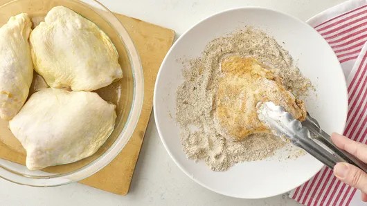 Coat chicken thighs on both sides with oil. In large bowl, mix remaining ingredients. Add chicken and turn to coat, pressing to adhere.