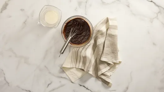 Step5In large bowl, place chopped chocolate and set aside. In 4-quart saucepan, heat whipping cream and corn syrup to a simmer over medium heat. Remove from heat and add 2 teaspoons vanilla. Pour mixture over chocolate and cover bowl with plastic wrap; let stand 5 minutes. Remove plastic wrap and beat with wire whisk until chocolate is smooth. Cover bowl with plastic wrap and chill 30 minutes. Stir well and refrigerate 30 minutes longer. Continue to stir every 30 minutes until icing is spreadable, about 2 hours total.