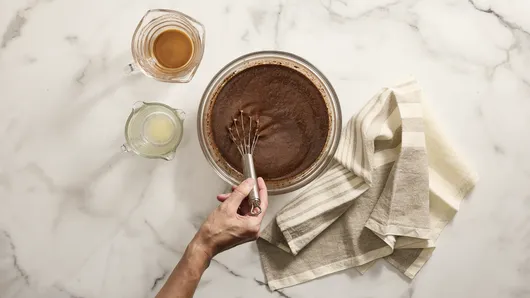 Step3In very large bowl, beat flour, granulated sugar, brown sugar, baking soda and salt with wire whisk. Pour coffee mixture over dry ingredients and stir just until no dry flour mixture is visible. In small bowl, beat eggs and egg yolk with wire whisk. Add to flour mixture, beating well. Stir in sour cream and 2 teaspoons vanilla until well mixed.