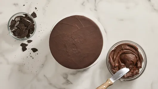 Place about 2 tablespoons icing in center of serving plate or stemmed cake plate. (This will steady the cake as you ice it.) Place 1 layer on plate and spread approximately 1 1/2 cups icing to edge of layer. Top with another layer and spread 1 1/2 cups icing to edge. Top with last layer. Frost side and top with remaining icing. Smooth top and side of cake. Use hands to liberally press cookie coating into side of cake. Repeat all around cake to cover side with coating as desired.
