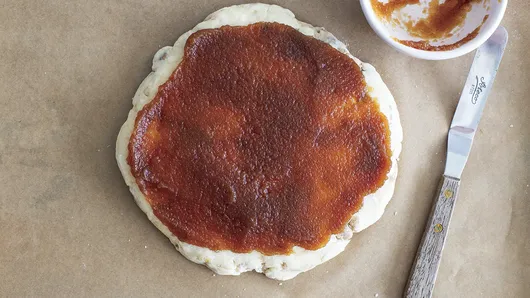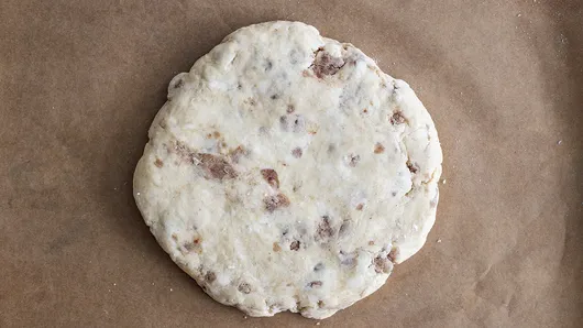 Turn the dough out onto a smooth surface dusted with flour. Knead a few times until mixture comes together to form a dough. It should have visible flecks of butter and resemble biscuit dough. Pat the dough into an 8-inch round, about 1/2- to 3/4-inch thick.
