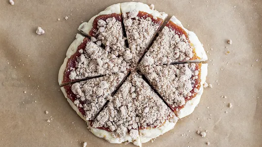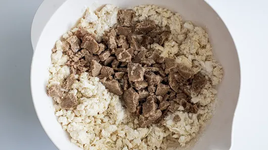 Then, using a fork, break up the remaining refrigerated crumble mixture and scatter over the top. Cut the scones into 8 equal wedges.