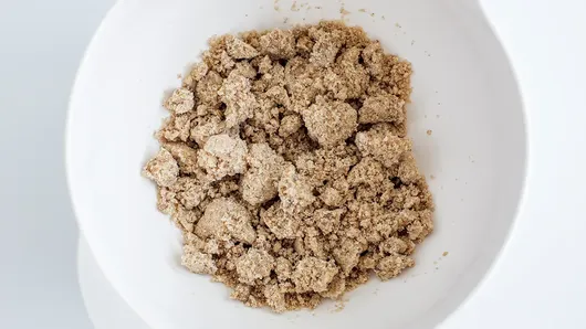 In a medium bowl, whisk together the egg and milk. Pour into the butter mixture and gently stir with a rubber spatula until the liquid is incorporated and the dough comes together when pressed firmly (it will be dry and crumbly). Remove the crumble mixture that was in the freezer, break into pieces and add to the dough.