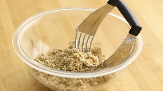 Step1In medium bowl, mix brown sugar, flour, oats, cinnamon and nutmeg. Cut in butter using pastry blender or fork until mixture is crumbly. Set aside.