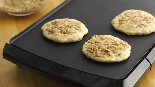 Step3For each pancake, pour 1/4 cupful batter onto hot griddle. Sprinkle each pancake evenly with scant 2 tablespoons and Streusel mixture. Cook 2 to 3 minutes or until bubbly on top and dry around edges. Turn; cook other side until light golden brown around edges about 1 minute to 1 minute 30 seconds. Scrape off griddle between batches of pancakes if necessary.