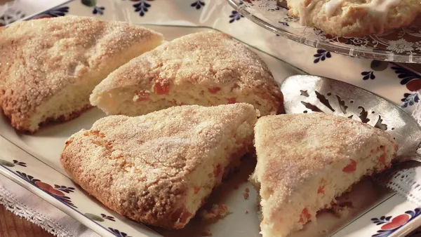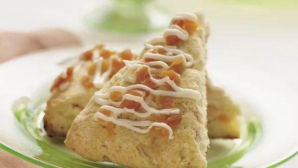 Step3Bake 10 to 13 minutes or until light golden brown. Cool 5 minutes. Meanwhile, in small bowl, mix powdered sugar and enough orange juice for desired drizzling consistency. Drizzle icing over warm scones. Serve warm.