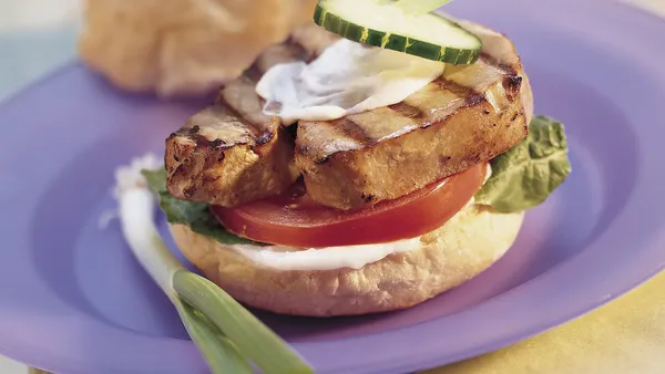 Step2If tuna steaks are large, cut into 8 serving pieces. In shallow glass or plastic dish or resealable food-storage plastic bag, mix vegetable oil, soy sauce, brown sugar, sesame oil, gingerroot and garlic. Add tuna; turn to coat with marinade. Cover dish or seal bag and refrigerate, turning once, at least 2 hours but no longer than 4 hours.