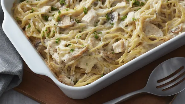 Fat-free ricotta cheese and reduced-fat sour cream hug a delicious pasta-chicken mixture with yellow bell pepper, red onion, asparagus and fresh basil.