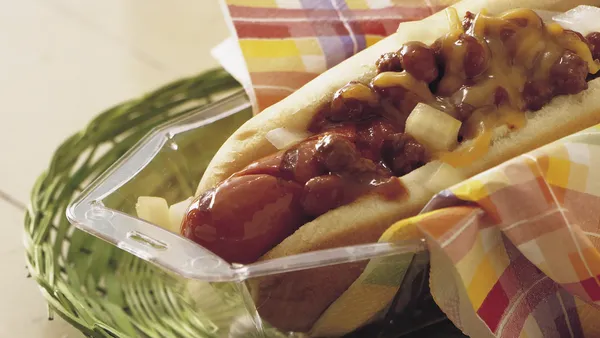 Four ingredients and 15 minutes give you these grilled beef hot dogs spread with chili and topped with coleslaw - a spicy dinner.
