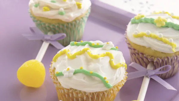 Step5Frost cupcakes with remaining white frosting. Pipe designs on cupcakes with yellow and green frostings. Decorate as desired with candy sprinkles. With bamboo skewer, poke hole in side of each cupcake. Tie ribbon bow in center of each lollipop stick. Add gumdrop to one end of each stick. Insert other ends of sticks into sides of cupcakes, just below frosting, to form rattles. Store loosely covered.