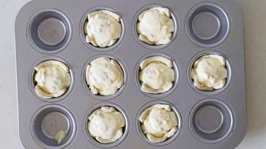 Step3In medium bowl with electric hand mixer or stand mixer, beat cream cheese until smooth. Add cream, eggs, cheese and chives; beat until just combined. Spoon enough of cream cheese mixture into each cup to reach edges of crescent dough (you may have a little cream cheese mixture left over).