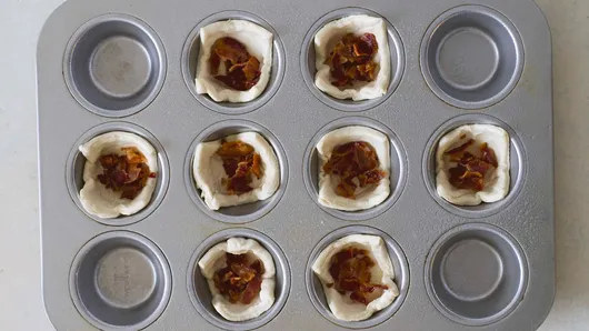 Step2Unroll dough into rectangle; press seams to seal. Use pizza cutter or sharp knife to cut dough into 8 equal-size squares. Gently press each square into bottom and sides of prepared muffin cups. Sprinkle half of crumbled bacon into bottom of each cup.