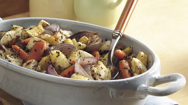 Step3Heat the oven to 425°F. Spray a 15x10x1-inch pan with the cooking spray. Place the squash, potatoes, onion, sweet potato and carrots in the pan. Pour the oil over the vegetables. Sprinkle with the garlic, sage, rosemary and salt. Stir to coat vegetables.