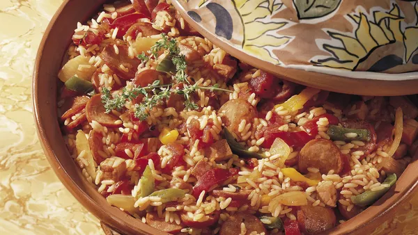 Serve your family this baked jambalaya made using Muir Glen® organic diced tomatoes, bacon, ham and kielbasa to make a hearty dinner. Perfect if you love Cajun cuisine.