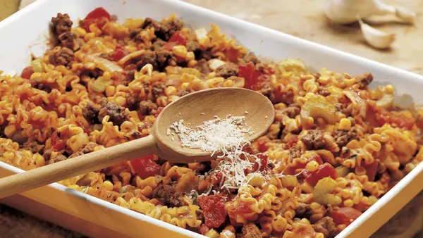 Step3Stir zucchini into beef mixture; cook 2 minutes. Stir in tomato sauce, tomatoes, oregano, salt and pepper. Heat to boiling. Add drained pasta; toss to coat. Spread in baking dish.