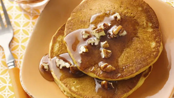 To serve, place 2 pancakes on each individual plate; spoon about 1/3 cup bananas and sauce over pancakes. Garnish with chopped nuts, and serve immediately.