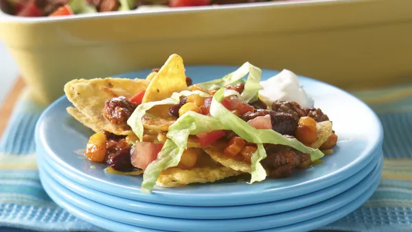 In ungreased 2-quart casserole, place 2 cups of the broken tortilla chips. Top evenly with beef mixture. Sprinkle with bell pepper, onions, 1 cup of the tomato, the cheese and olives.