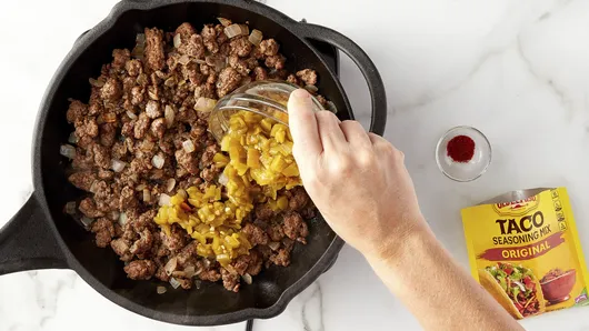 Step1In 10-inch cast-iron or nonstick skillet, cook beef and onions over medium-high heat 6 to 8 minutes, stirring occasionally, until beef is brown; drain. Decrease heat to medium. Stir in taco seasoning mix, red pepper and chiles. Cook 1 to 2 minutes longer or until slightly thickened. Remove from heat; spread beef mixture into even layer.