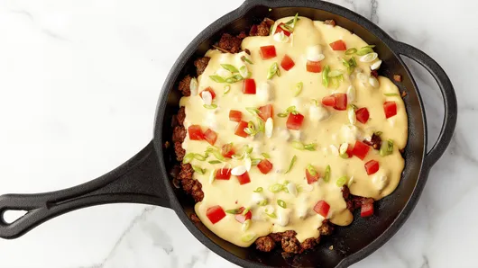 Get out your trusty skillet, because this easy, cheesy skillet queso recipe kicks off any game day gathering with a big punch of flavor! It's fully loaded with savory ground beef, green chiles and toppings of fresh cilantro, tomato and green onion—making this creamy, ultra-hearty skillet queso dip anything but boring. Serve it up as the perfect dippable, shareable appetizer, complete with a side of crunchy tortilla chips.