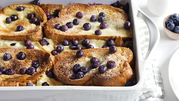 Step2Pour bread mixture into casserole. Top evenly with cream cheese, blueberries and nuts. Cover and refrigerate at least 1 hour but no longer than 24 hours.