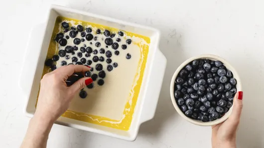 Sprinkle blueberries evenly over Bisquick™ batter. Bake 42 to 47 minutes, or until golden brown.