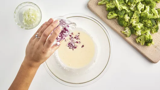 Step1Mix mayonnaise, sugar and vinegar in large bowl. Stir in broccoli and onion; toss until coated. Cover and refrigerate 2 hours to blend flavors.