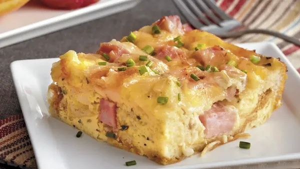 Step4Heat oven to 350°F. Uncover strata; bake 45 to 55 minutes or until knife inserted in center comes out clean. Let stand 5 minutes before cutting into squares.
