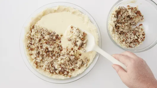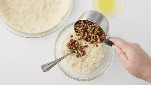 Step2In large bowl, stir together cookie mix and 1/2 cup softened butter; mix with pastry blender or fork until crumbly. Press 2 1/2 cups of the crumbly mixture in bottom and up side of pie plate. Add pecans and 1 tablespoon melted butter to remaining crumbly mixture; toss to combine, and set aside.