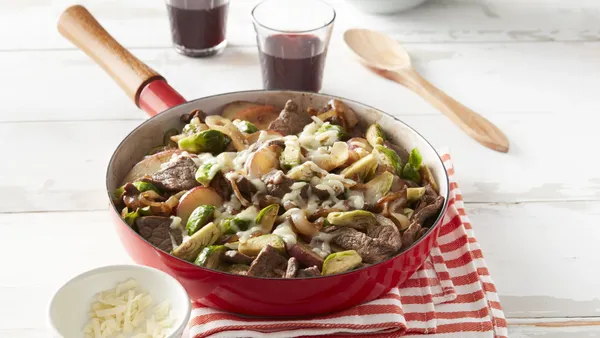 Step3Add bell pepper and onion to skillet; cook and stir 2 minutes. Add stir-fry sauce and red pepper flakes. Reduce heat; cook and stir about 2 minutes longer or until vegetables are crisp-tender. Stir in beef and Brussels sprouts & butter sauce; cook about 1 minute or until hot. Serve with rice.
