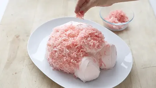 Spoon frosting into large bowl. Add red food color to make desired pink color. Place bowl cake on tray cut side down; spread 1/3 cup frosting over cake. Use frosting to adhere cupcakes to bowl cake for feet and bunny tail. Use toothpicks if necessary. Place marshmallow halves, cut sides down, on tops of 2 cupcakes to make heels of feet. Spread thin layer of frosting over side and top of cake to seal in crumbs. Freeze cake 30 to 45 minutes to set frosting.