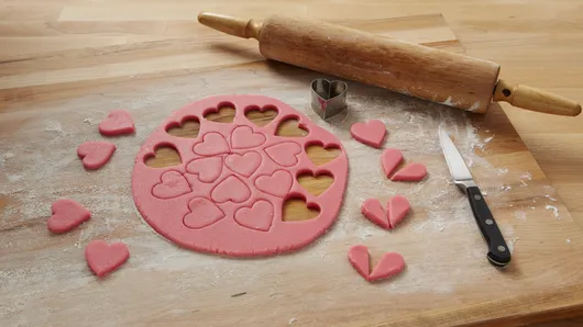 Step2Roll 1 portion of dough on lightly floured surface to 1/4-inch thickness. Using 1 1/2-inch heart-shaped cutter, cut out 18 heart shapes. Cut 6 of the heart shapes in half for ears. Dip shapes into granulated sugar. Tuck ears under 6 of the heart shapes to form ears on bunny faces. Place all on ungreased cookie sheet. Repeat with remaining portions.