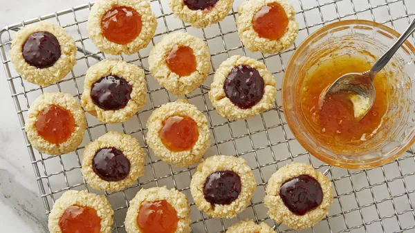 Step4Shape dough into 1 1/2-inch balls. Place 2 inches apart on cookie sheet. Press thumb into center of each cookie to make indentation, but do not press all the way to the cookie sheet. Fill each indentation with about 1 teaspoon of filling.