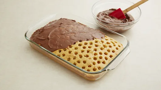 Step4In large bowl, beat Filling ingredients with whisk 1 minute (mixture will thicken). Pour over cake; spread evenly over surface, working back and forth to fill holes. (Some filling should remain on top of cake.) Refrigerate 1 hour.