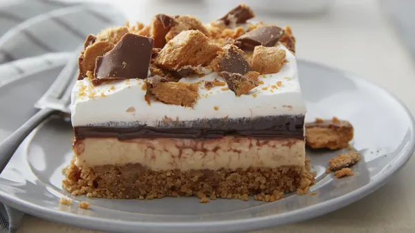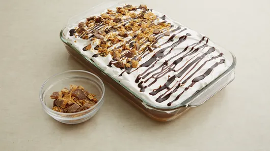 Betty Crocker™ Super Moist™ yellow cake mixed with peanut butter is a simple, but addictive base for this fun candy bar poke cake.