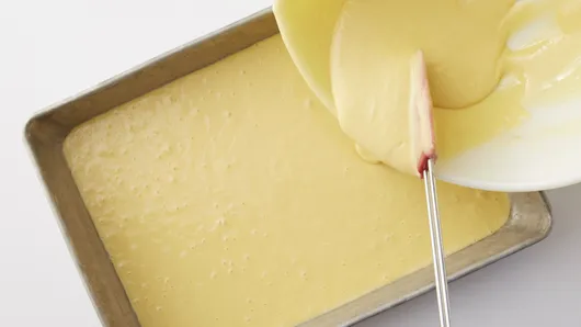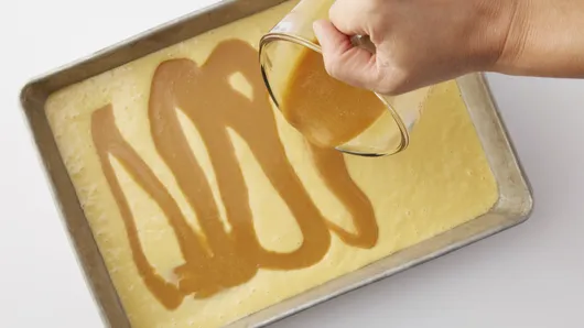 Step3In medium bowl, beat Butterscotch Layer ingredients with whisk until well blended. Transfer to 2-cup glass measuring cup, and evenly pour over top of cake batter in pan; mixture will sink to bottom as you pour over cake batter.