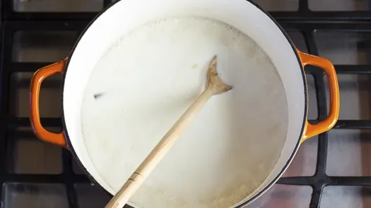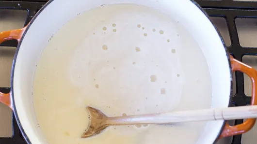 Step2When the milk comes to a boil, quickly remove from heat and add baking soda to the pot. The mixture will rise and get frothy, just keep stirring the mixture.