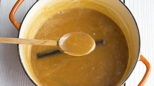 Step4After about an hour and a half, the milk should start to turn golden brown. Remove the cinnamon stick and the vanilla pod. At this point, it will start to thicken fast, so it’s important to keep stirring so the milk doesn’t burn on the bottom of the pan.