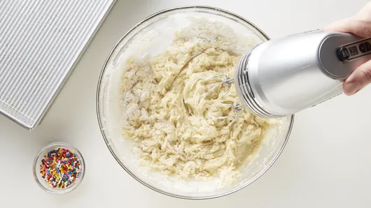 Step2In large bowl, beat sugar cookie mix, cake mix, melted butter, eggs and 1 teaspoon vanilla with electric mixer on low speed 30 seconds. Beat on medium speed about 1 minute or until blended. Stir in 3 tablespoons candy sprinkles. Spread in pan.