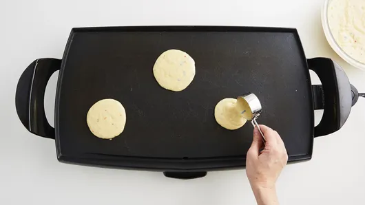 Step3Brush griddle with vegetable oil or shortening. For each pancake, pour slightly less than 1/4 cup batter onto hot griddle. Cook until edges are dry. Turn; cook until golden brown. Remove from griddle to serving plate. Repeat with remaining batter.