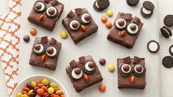 Step2Frost brownie with frosting. Sprinkle with candy sprinkles. Cut into 4 rows by 4 rows. Store covered at room temperature.